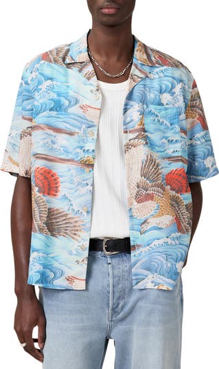 Surrender to a surreal blend of soaring willows and restless waves that dance across this short-sleeve button-up spun from fluid fabric and crowned with a cool convertible collar.
