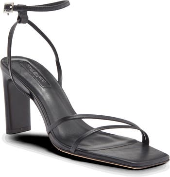 Slim straps bring a clean, minimalist look to this leather sandal lifted by a wide, column heel for added dimension.