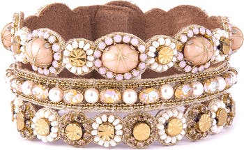 Show off boho sparkle with this suede-backed magnetic cuff bracelet aglow with lustrous faux pearls, polished beads and light-catching crystals.
