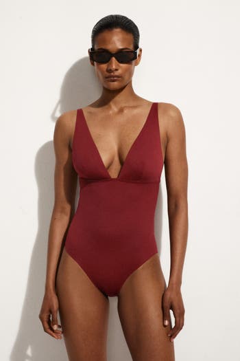 Modern shapes and innovative materials define the COS summer wardrobe. Crafted from spongy scuba knit, this swimsuit has a high-apex silhouette with a deep V-neckline, darted cups and bonded edges for a clean finish. Style it with linen pants and a pair of aviators.