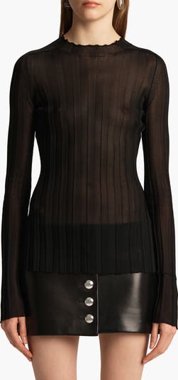 Wide-set ribbing conceals and reveals to alluring effect on this figure-skimming top from Catherine Holstein's roster of coveted knits—lauded by fashion insiders since the New York label's debut. Lettuce-edge trim sweetens the look.
