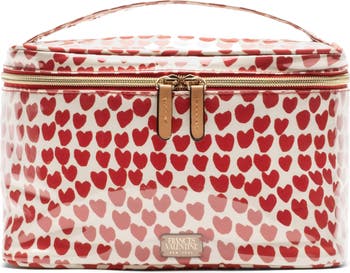 A vibrant print enriches the water-repellent exterior of a travel-ready train case featuring a structured profile and interior pockets perfect for keeping your essential cosmetics secure while on the go.