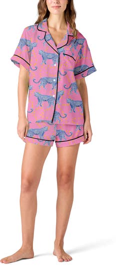 Introducing Cosmic Cheetah, an homage to our top-selling Cheetah print. Paired with our favorite bubblegum pink, this design seamlessly marries the beloved cheetah with a touch of celestial allure. Accentuated by navy contrast piping, Cosmic Cheetah is a perfect blend of style and wild sophistication. Our Women’s Pajama Shorts Set — is cut in a timeless silhouette with classic piping detail. The shorts’ elastic waist and adjustable ribbon tie ensure a custom, universally flattering fit.