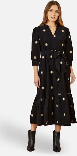 This all over cosmic embroidery midi dress is perfect for everyday wear all season long. The cosmic embroidery of moon and stars adds a whimsical feel. The self tie belt gives this shirt dress some shape, with flattering notch neckline and 3/4 sleeves completing the look.