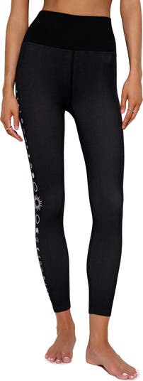 Moon phase graphics race down the sides of high-waisted leggings fashioned from stretch nylon with cropped legs.