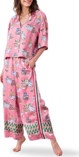 Cats take a spa day—as they should—on these comfortable satin pajamas cut in a loose fit that make them perfect for lounging and sleeping.