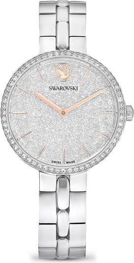 Rose gold–tone hands and markers pop against the glittery dial of this stainless steel bracelet watch haloed in signature Austrian crystals.