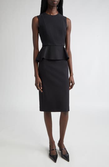 A flouncy peplum adds a waist-accentuating flourish to this sleeveless dress tailored in a sheath silhouette from technical jersey with a piqué effect.