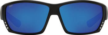 Rectangular frames maximize the modern appeal of oversized sunglasses fitted with lenses that are mirrored and polarized.