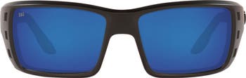 Mirrored and polarized lenses heighten the style and functionality of standout sunglasses with oversized rectangular frames and glossy logos at the temples.