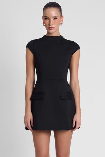 A cap-sleeve mini dress crafted from premium knit fabric, designed with a fitted bodice that sculpts to the body’s natural curves. The hips feature a slight shaping effect, and the silhouette falls to a mini length. Faux pockets at the hips add a classic, elegant touch.