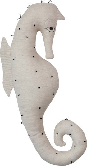 - A serene white seahorse-shaped pillow, crafted from cotton and linen, that brings the calm of the ocean into the home