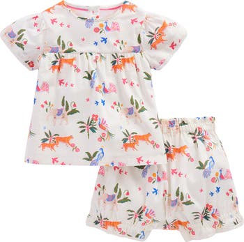 Your tiny trendsetter can move in the fresh, breathable comfort of this all-cotton set featuring a whimsically patterned babydoll top and a pair of matching bloomers.