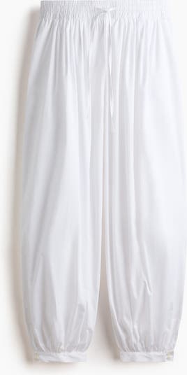 Loose-fit trousers in an airy cotton weave with smocked elastication and a narrow drawstring at the waist. Gathers at the front and back and balloon legs with a slit and buttons at the hems.