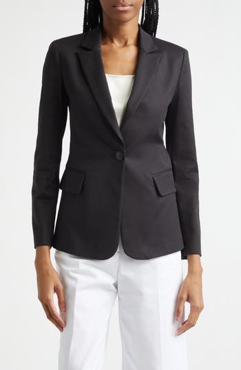 A single button simply closes a staple blazer cut from a lightweight cotton blend.