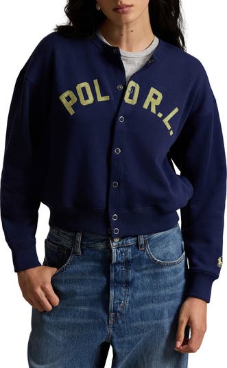 A logo graphic enhances the sporty vibes of this crewneck cardigan knit from breathable cotton-blend yarns.