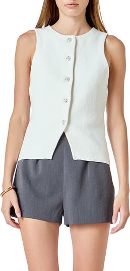 Sized to wear on its own, this trim textured-knit vest features a notched hem and glossy buttons.