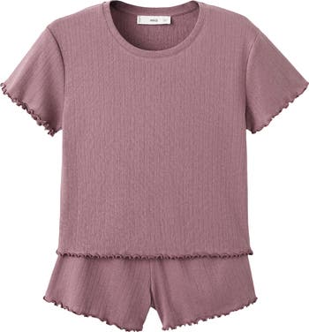 Lounge or sleep sweetly in these soft pointelle-knit pajamas finished with frilly lettuce-edge trim.