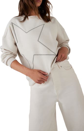 Cream tone sweatshirt with a crew neckline, long sleeves, drop hemline and star motif.