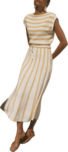 Striped A-line dress in a midi silhouette featuring a crew neckline, cap sleeves with a tie fastening through the waistband.