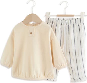 Button placket detailing on the sweater and rolled-hem stripe pants give this cotton-blend set a refined, put-together look that keeps your babe looking polished from morning to naptime.