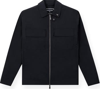 Playful branding at the collar authenticates a pocket-popped jacket made from a cotton-forward blend.