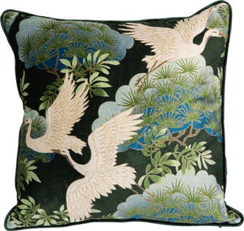 Cotton Blend Velvet Printed Pillow with Cranes and Piping, Multicolor