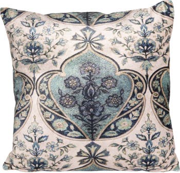 - A luxurious square pillow featuring a floral pattern in cream and blue