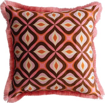 - A luxurious square pillow featuring an ogee pattern with eyelash fringe in multicolor