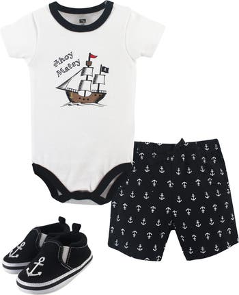 Hudson Baby bodysuit, shorts, and shoe is a perfect outfit to dress your baby for spring and summer days out. The outfit includes bodysuit and shorts made of 100% interlock cotton with a matching pair of shoes.