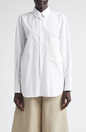 Forget business as usual. Rei Kawakubo turns staid tailoring into a tactile statement with this smooth, crisp cotton-broadcloth button-up shirt featuring a chest patch pocket of ornate chemical lace.