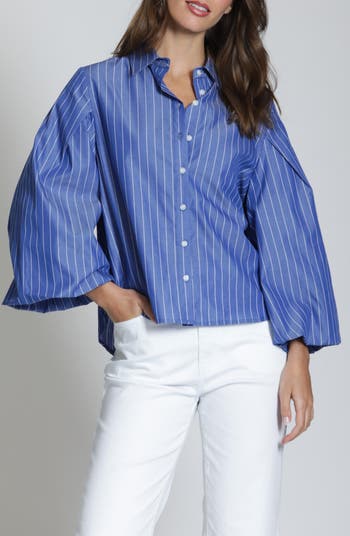 Generous bubble sleeves bring a relaxed look to this cotton shirt cut with a pointed collar and fastened with pearly buttons down the front.