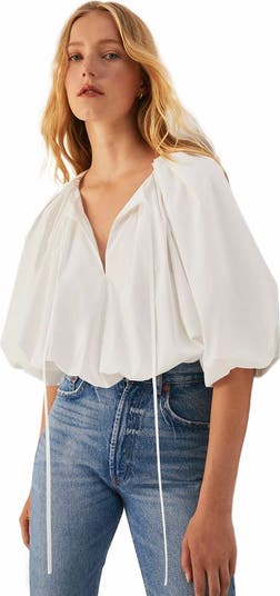 A new shape. This beautifully draped poplin bubble top has pleats at the open neckline that create volume into an elasticated waist and cuffs.