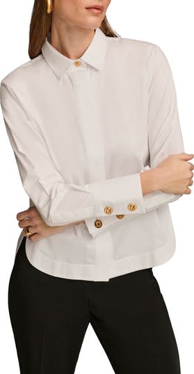 A covered placket streamlines the style of an essential cotton shirt finished with signature brassy buttons closing the cuffs.
