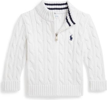 Soft cotton cables bring classic style to a zip-front cardigan styled with contrasting stripes inside the collar.