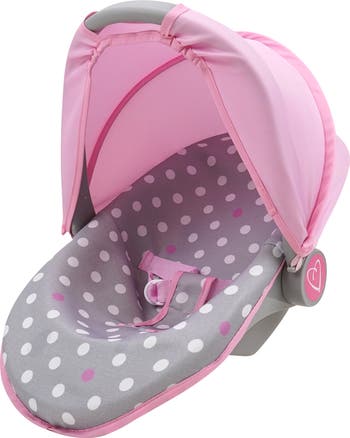 509 CREW: COTTON CANDY PINK: 3-IN-1 DOLL CAR SEAT - PINK & GREY POLKA DOT - This 3-in-1 Doll Car Seat is super cute with a fun bright pink and gray polka dot pattern and the perfect on the go accessory. This car seat is more than just a car seat; it's a multifunctional unit that adapts to your child's playtime needs. Use it as a doll carrier to take your favorite doll along on adventures, transform it into a feeding chair for mealtime play, or convert it into a cozy lounger for doll naptime. It's three delightful accessories in one! The 509 Crew Deluxe Doll Car Seat includes an adjustable harness belt to keep the baby doll secure and a retractable canopy. The Doll Car Seat includes removable polyester fabric which can be hand wiped if it gets dirty. For a fun adventure, you can take your Doll Car Seat in the car on road trips and even place a seat belt over to ensure your doll is secure and safe! It's the perfect gift for young caregivers and their beloved dolls, fostering a world of imaginative play. Designed for dolls up to 18” (45cm). ***Doll not included.*** This product is made for kids 3 years and up.