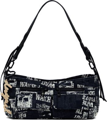 A newspaper-inspired print brings an edgy aesthetic to a durable cotton canvas bag featuring ample compartments and multiple straps for on-the-go convenience.