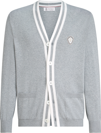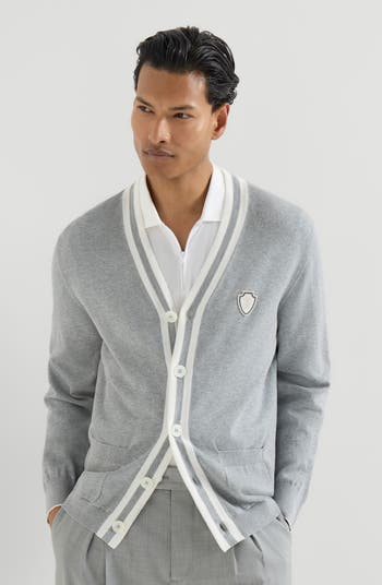 - Mother of pearl button closureRib knit V-neckPatch hand pocketsRib knit cuffs and bottom band