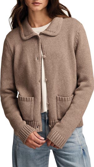 A curved collar and covered buttons polish a staple cardi knit from soft cotton.