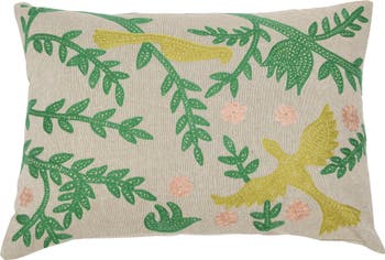 - Multicolor cotton chambray lumbar pillow with bird and branch embroidery