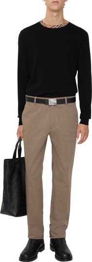 A pair of chinos in cotton twill, tailored to a slim fit. The design features a Burberry Check tab and is embroidered with a tonal Equestrian Knight Design.||Button and zip closure|Side slip pockets, back button welt pocket|Embroidered Equestrian Knight Design at back pocket
