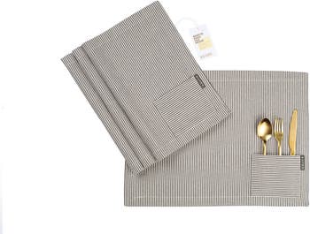 A simple way to elevate your table day in and day out. Crafted from a soft, sturdy cotton blend with 50% upcycled fibers, Meema placemats are designed to bring texture, warmth, and intention to every meal. The fabric has a gentle, lived-in feel, with enough structure to lay flat and maintain its shape after every wash. Available in a range of natural tones and quiet stripes, these placemats layer beautifully across casual breakfasts and thoughtful gatherings alike. Why You'll Love Them |Set of 4 cloth placemats |Made with 100% cotton, 50% upcycled |Soft hand-feel with everyday durability |Easy to care for—machine washable |Ethically made in India |A timeless table staple—refined, relaxed, and rooted in sustainability. |Size 14" x 19"