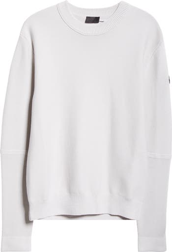 Enjoy multiseason wear from this crewneck sweater knit with articulated sleeves from cotton and marked at the back yoke and one sleeve with Moncler iconography.