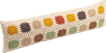 - A cozy and colorful lumbar pillow that features a cotton crocheted fabric in multiple colors and a block pattern