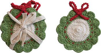 - A festive and cozy set of coasters that features a cotton crocheted wreath shape in green, red and white colors