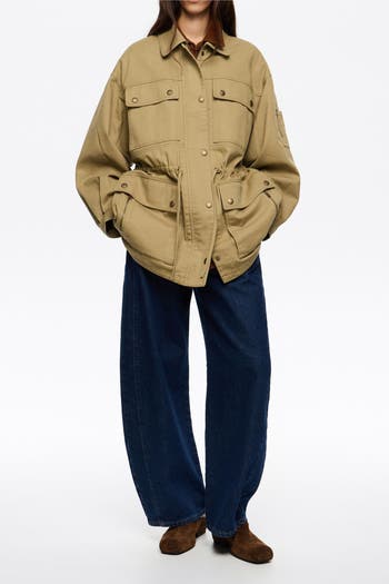 - Fabric drawstring waist and multi-use pocket at the sleeve