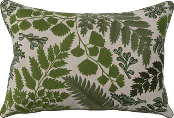 - A beautiful and cozy lumbar pillow with a cotton cover, featuring green embroidered botanical prints on a natural background