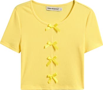 A quartet of bows aligns on a stretchy rib-knit T-shirt that will complement most anything in your child's closet.