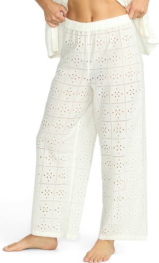 Bold eyelet details lend a semisheer effect to these effortless cover-up pants with wide legs.