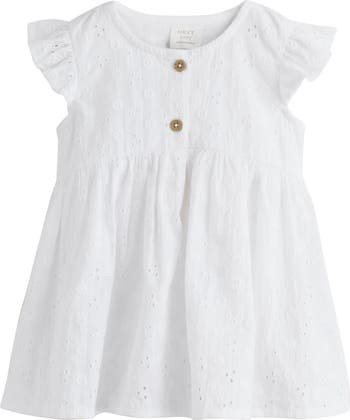 Eyelet embroidery adds depth and detail to a crisp-white dress for baby that has them looking as sweet as ever.